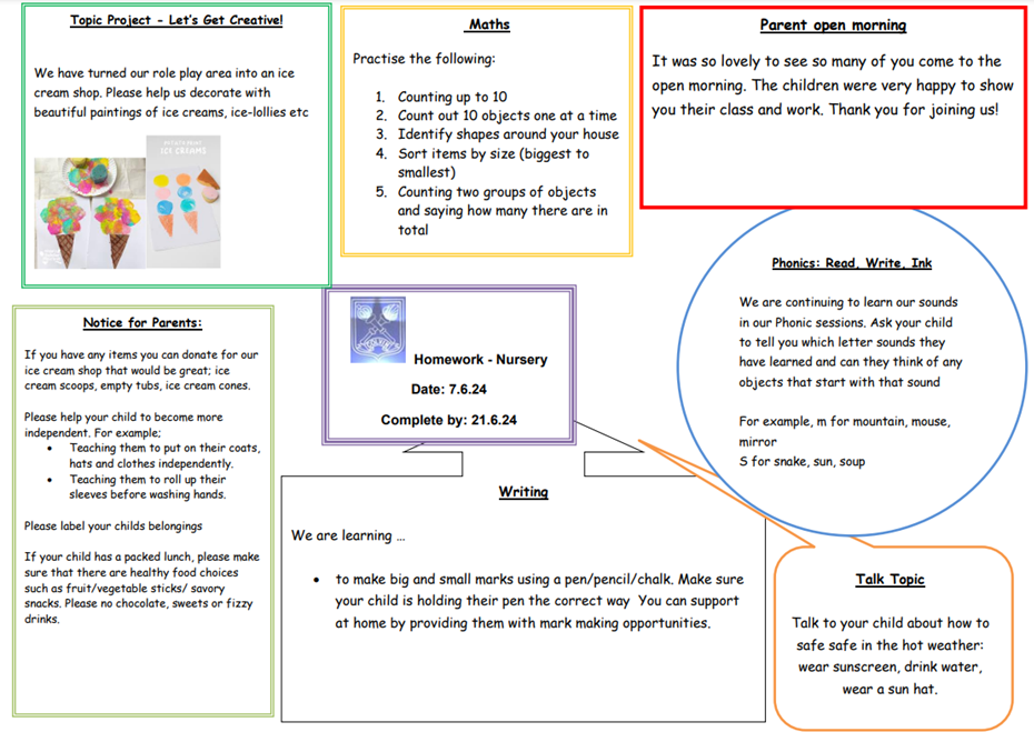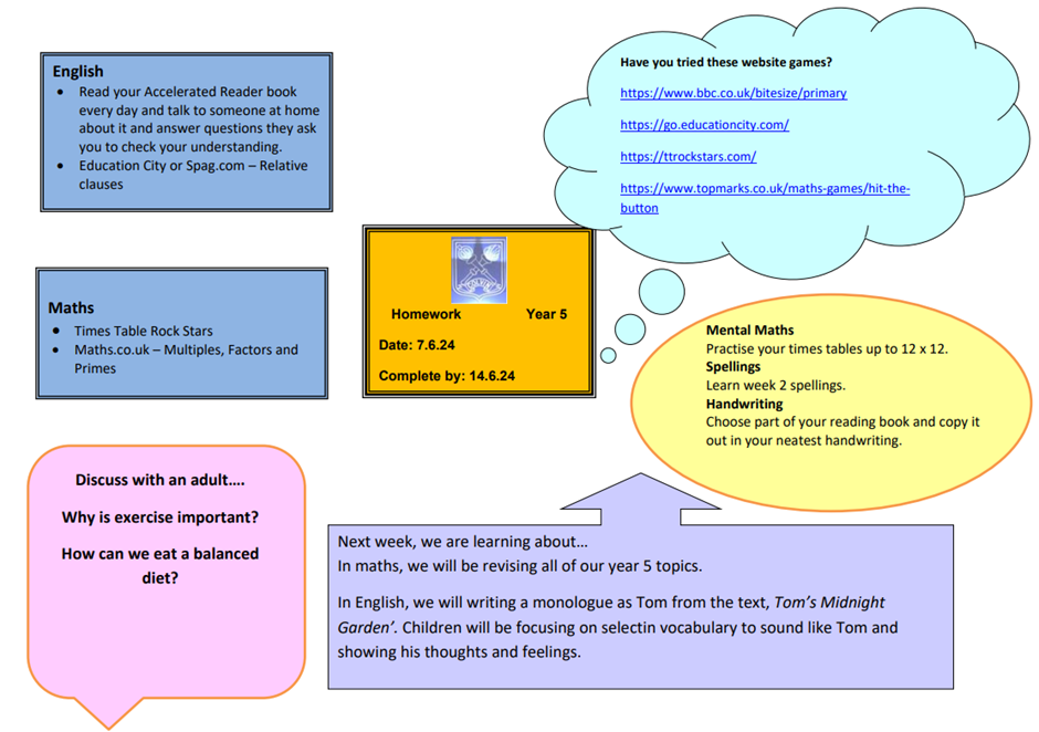 Daily homework tasks will consist of short, regular activities such as reading aloud to an adult or practising spellings. Weekly homework will be set by teachers on a Friday and is expected to be completed by the following Tuesday. Termly curriculum projects will be set for pupils to complete during a half-term break.
