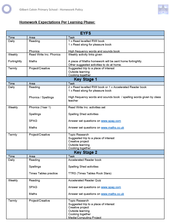 It is our expectation that the school, pupils and parents are all equally responsible for the completion of homework. At Gilbert Colvin we have daily, weekly and termly homework expectations.