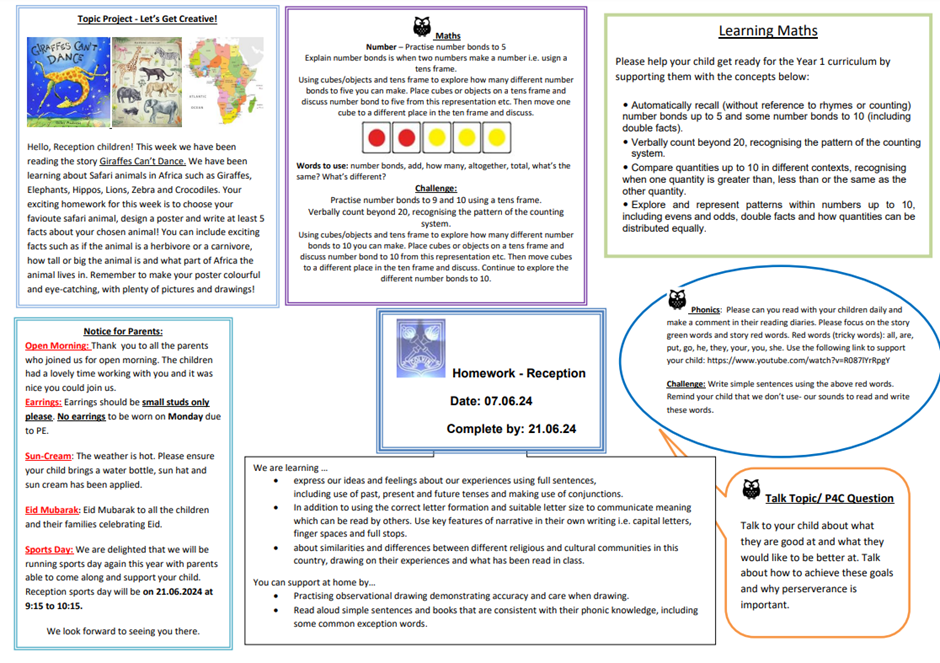 Daily homework tasks will consist of short, regular activities such as reading aloud to an adult or practising spellings. Weekly homework will be set by teachers on a Friday and is expected to be completed by the following Tuesday. Termly curriculum projects will be set for pupils to complete during a half-term break.